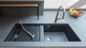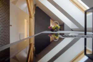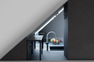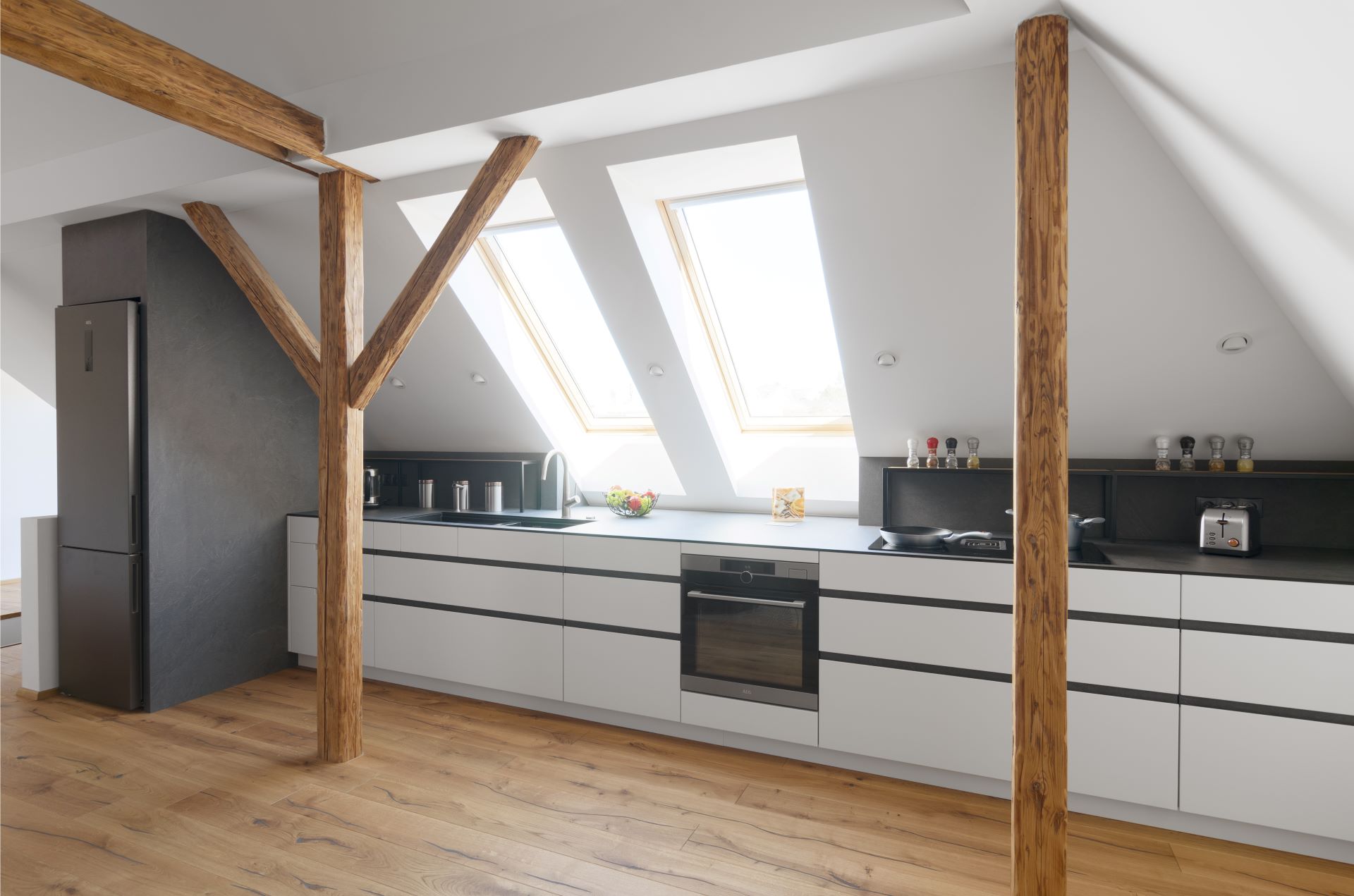 Největší výzvou bylo najít vhodné řešení pro umístění vysoké lednice. Naopak právě díky zkosenému stropu má pracovní deska rozlohu téměř letiště – její hloubka je 1,2 metru a celková délka přes 6 metrů. Z pohledu designu stojí za zmínku na zakázku vyráběné kovové police na pracovní desce, které díky zalakování a zcela zabroušeným svárům budí dojem jednoho kusu.