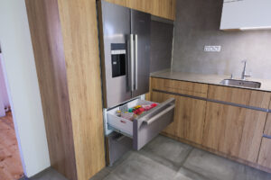 Pro mladou rodinu je klíčový dostatek místa pro potraviny a nádobí. Proto byla do sestavy zakomponována velká lednice typu French-door, která nabízí obrovský objem a přehledné uspořádání potravin. Kromě toho byl kladen důraz na maximální využití úložného prostoru v celé lince.