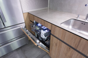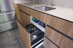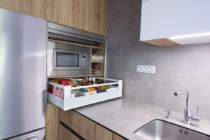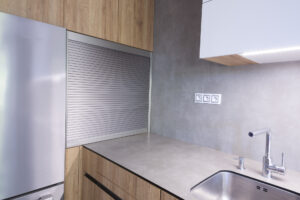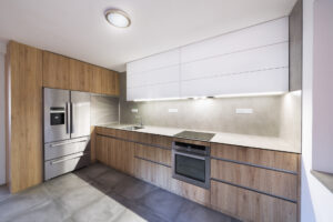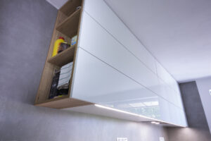 Aby byla manipulace v kuchyni co nejpohodlnější a nejbezpečnější, byly horní skříňky vybaveny velmi kvalitním výklopným systémem Blum Aventos. Tento systém umožňuje snadné a tiché otevírání a zavírání, a skvěle drží dvířka v jakékoli poloze, což je neocenitelné při práci v kuchyni. Je to prvek, který výrazně zvyšuje komfort každodenního používání.