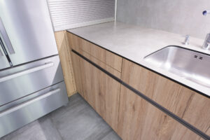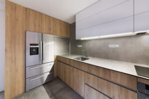 Na konci sestavy vysokých skříní se sloup chytře „ztratil“ tím, že byl zakryt totožným materiálem, jaký je použitý pro kuchyňské skříně (dekor beton/dub). Sloup tak nebyl maskován, ale zapracován jako integrální součást sestavy. Na první pohled se jedná o čistý, hladký obklad stěny, který sestavu přirozeně ukončuje a vizuálně tvoří jednolitý celek. Toto chytré řešení proměnilo stavební vadu v designový prvek.
