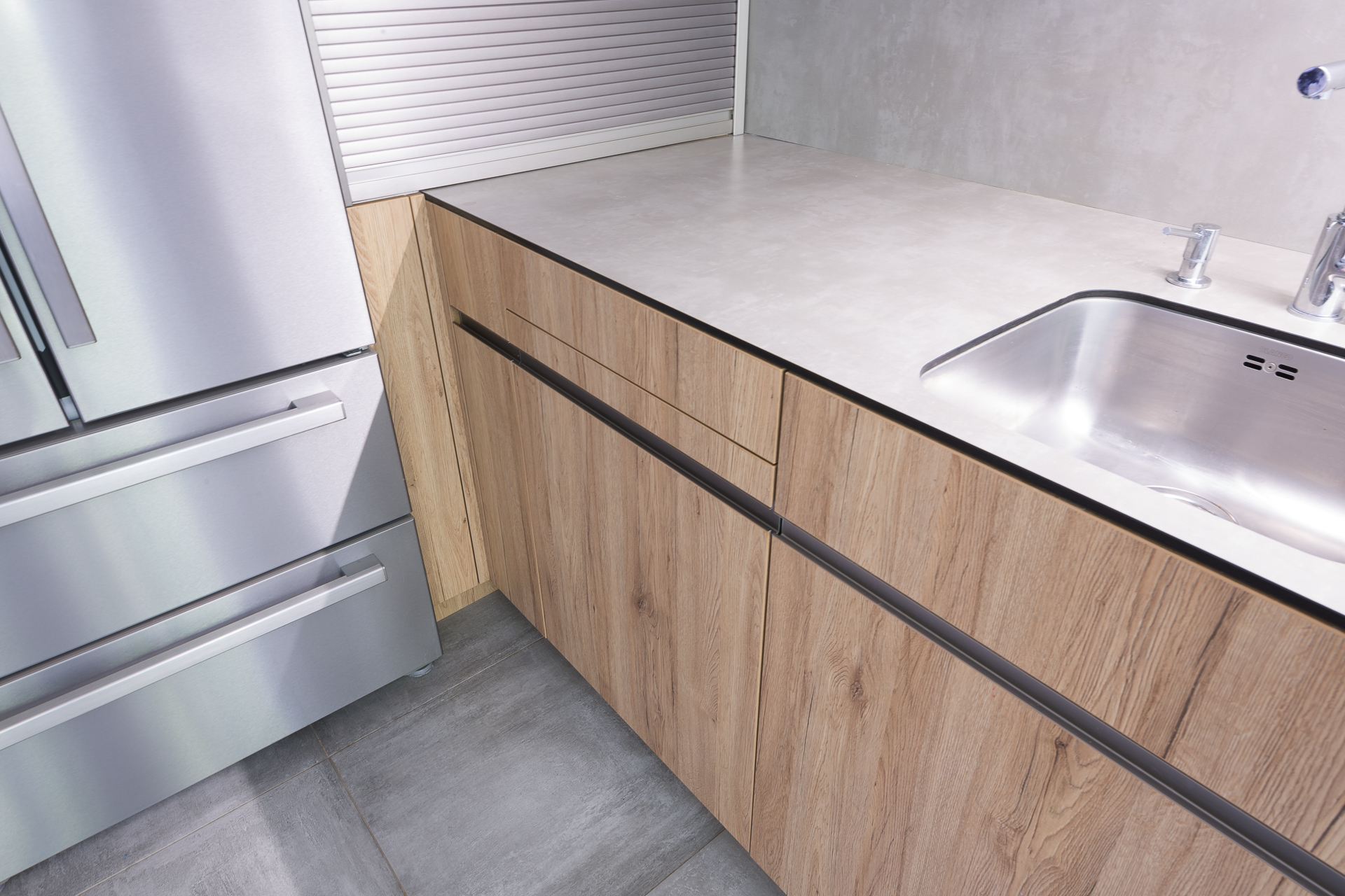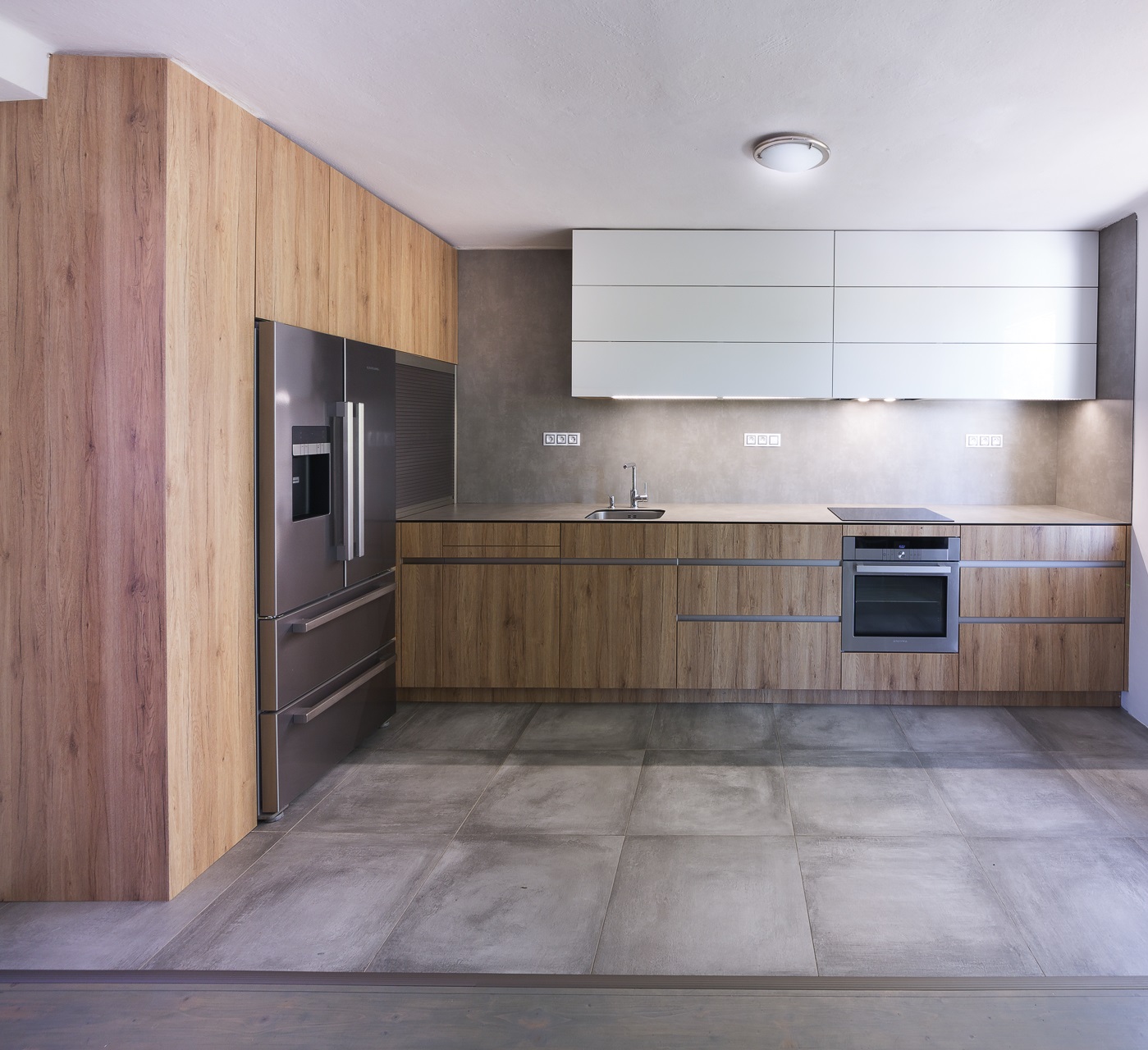 Na konci sestavy vysokých skříní se sloup chytře „ztratil“ tím, že byl zakryt totožným materiálem, jaký je použitý pro kuchyňské skříně (dekor beton/dub). Sloup tak nebyl maskován, ale zapracován jako integrální součást sestavy. Na první pohled se jedná o čistý, hladký obklad stěny, který sestavu přirozeně ukončuje a vizuálně tvoří jednolitý celek. Toto chytré řešení proměnilo stavební vadu v designový prvek.