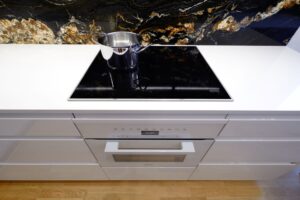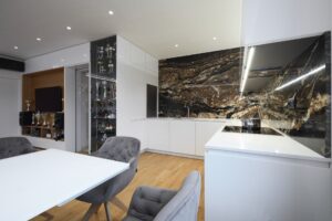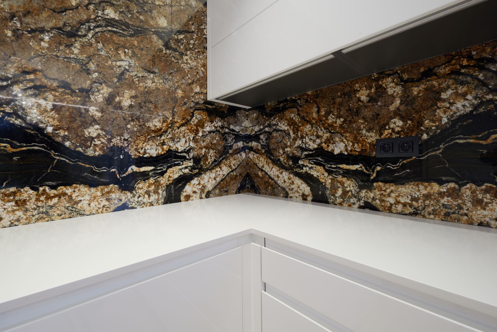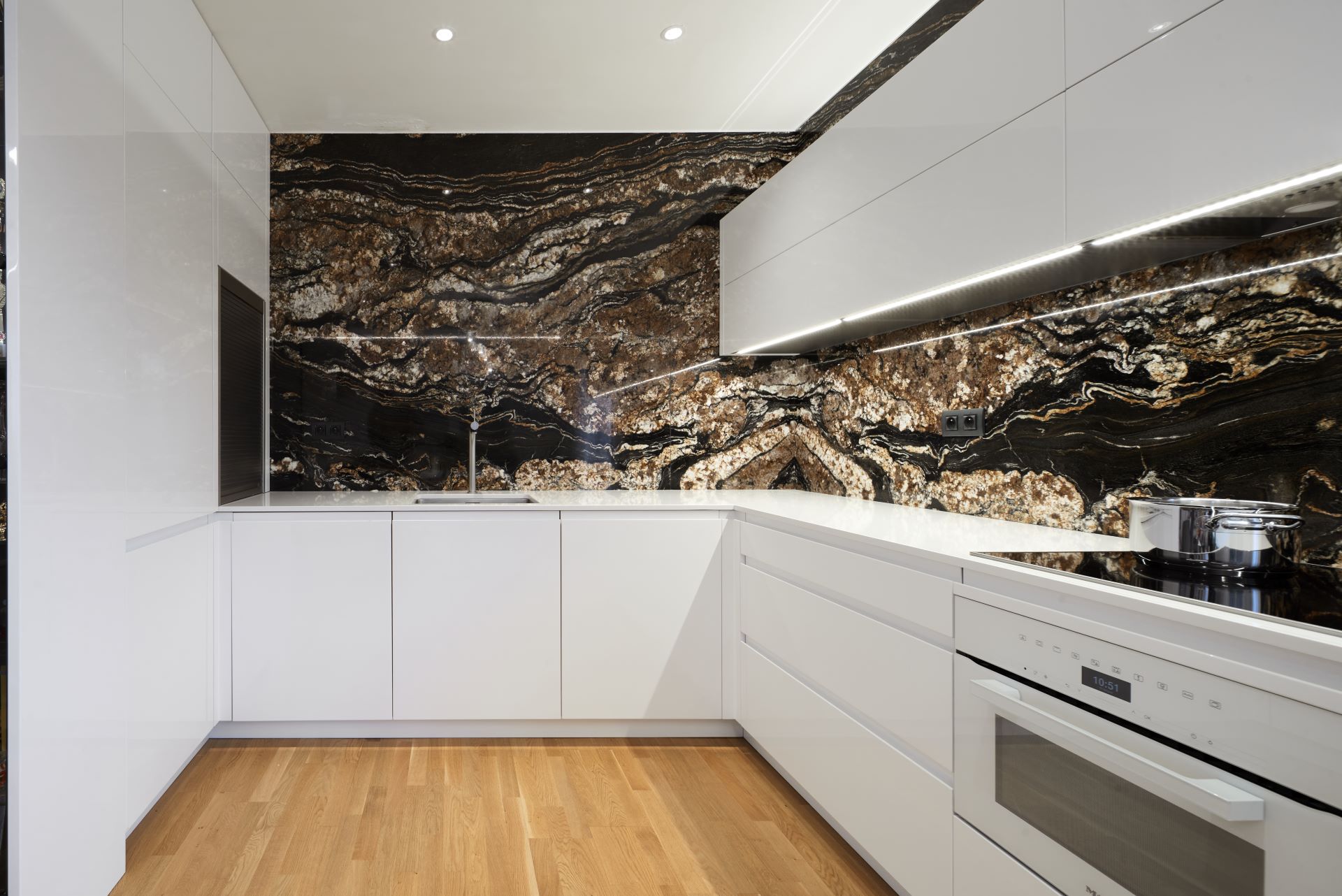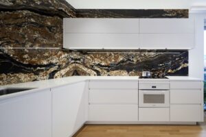 Žulová pracovní deska je a vždy bude top produkt a třeba i kuchyň z lamina posune do vyšší kategorie. Exotická žula, jako třeba Fusion Black, dělá pak z kuchyně téměř umělecké dílo. Právě Fusion Black se svojí typickou neuvěřitelnou kresbou je hlavní dominantou v této jinak čistě bílé kuchyni. Zkrátka první, co Vás v kuchyni ihned upoutá, je právě tato exotická žula. A právě to bylo i velké přání zákazníka od samého začátku.