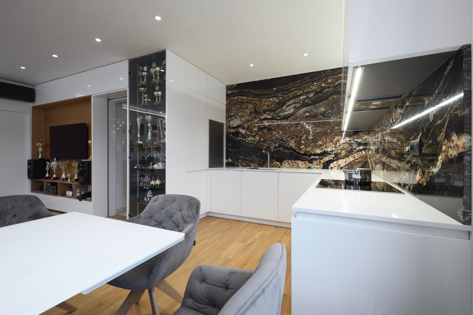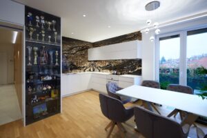 Nasvícená vitrína je skvělým způsobem, jak přechod mezi kuchyní a obývací částí zvýraznit a zároveň vytvořit prostor pro vystavení cenných předmětů. V tomto případě je to ideální řešení pro rodinu s dětmi, které si mohou své trofeje vystavit na čestném místě.