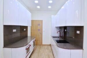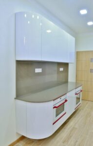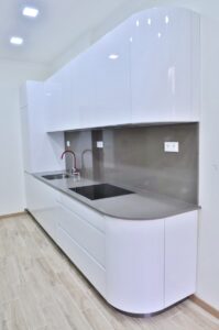 Pro samotné korpusy a dvířka jsme zvolili lakovaný povrch v bílém lesku. Bílý lak je ideální volbou do malých prostor, protože maximálně odráží světlo, čímž opticky zvětšuje místnost a zdůrazňuje čistotu a lehkost designu.