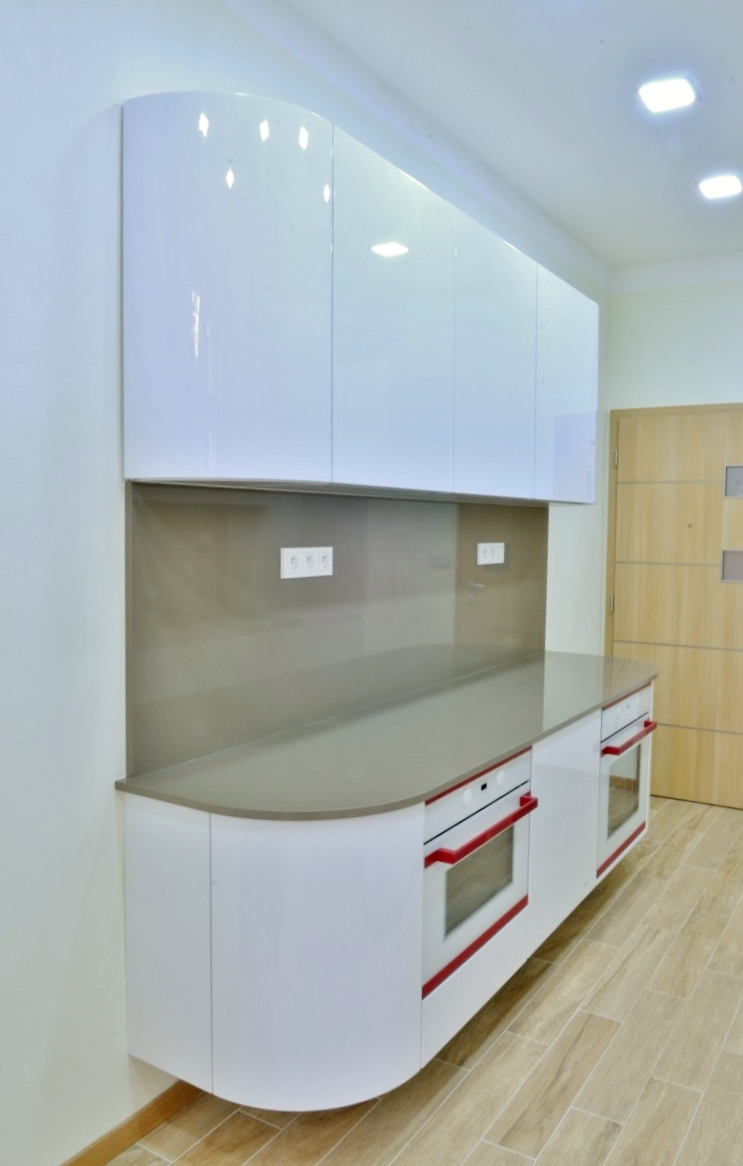 Výsledkem je harmonická, vizuálně odlehčená kuchyně, která skvěle využívá malý prostor. Kombinace oblých linií, lesklé bílé a tmavé pracovní desky spolu s prémiovými, designovými spotřebiči vytváří unikátní a funkční celek.