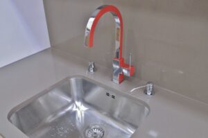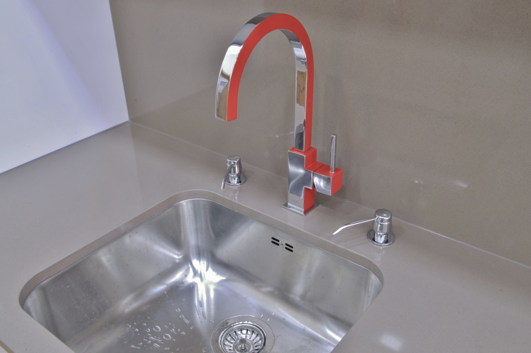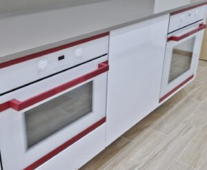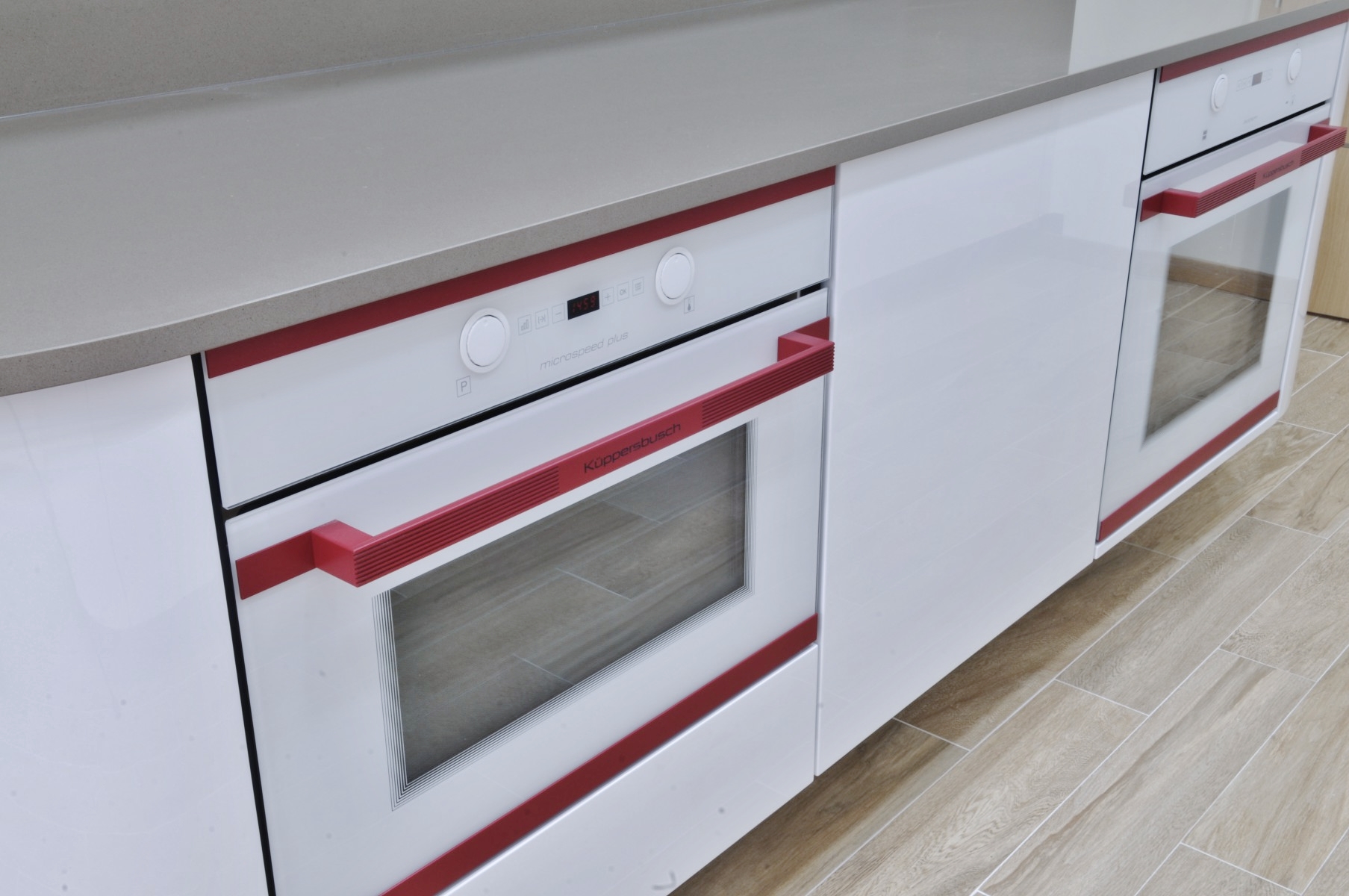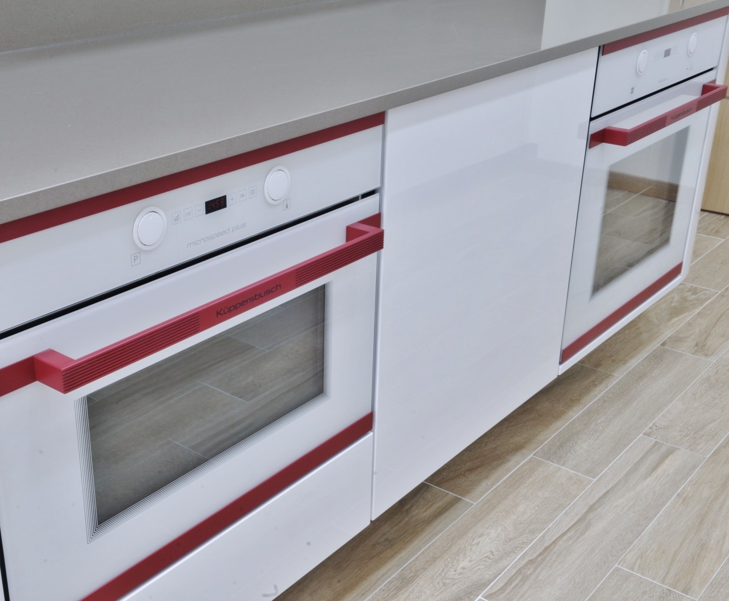 Tyto spotřebiče jsou speciálně vybrány také v bílo-červeném designu, čímž vnáší do jinak decentní, oblé a bílo-béžové kompozice nečekanou dynamiku a osobitý punc. Červený detail na bílém podkladu skvěle koresponduje s moderní, ale neokoukanou estetikou celé kuchyně.
