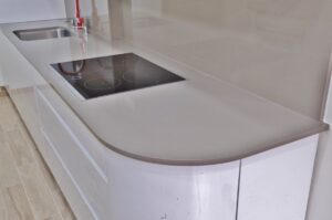 Protiváhu k lesklé bílé tvoří pracovní deska z tvrzeného kamene Technistone v odstínu tmavé béžové . Tato volba zajišťuje potřebný kontrast, dodává prostoru stabilitu a teplo. Technistone zároveň zaručuje vysokou odolnost proti poškrábání a snadnou údržbu.