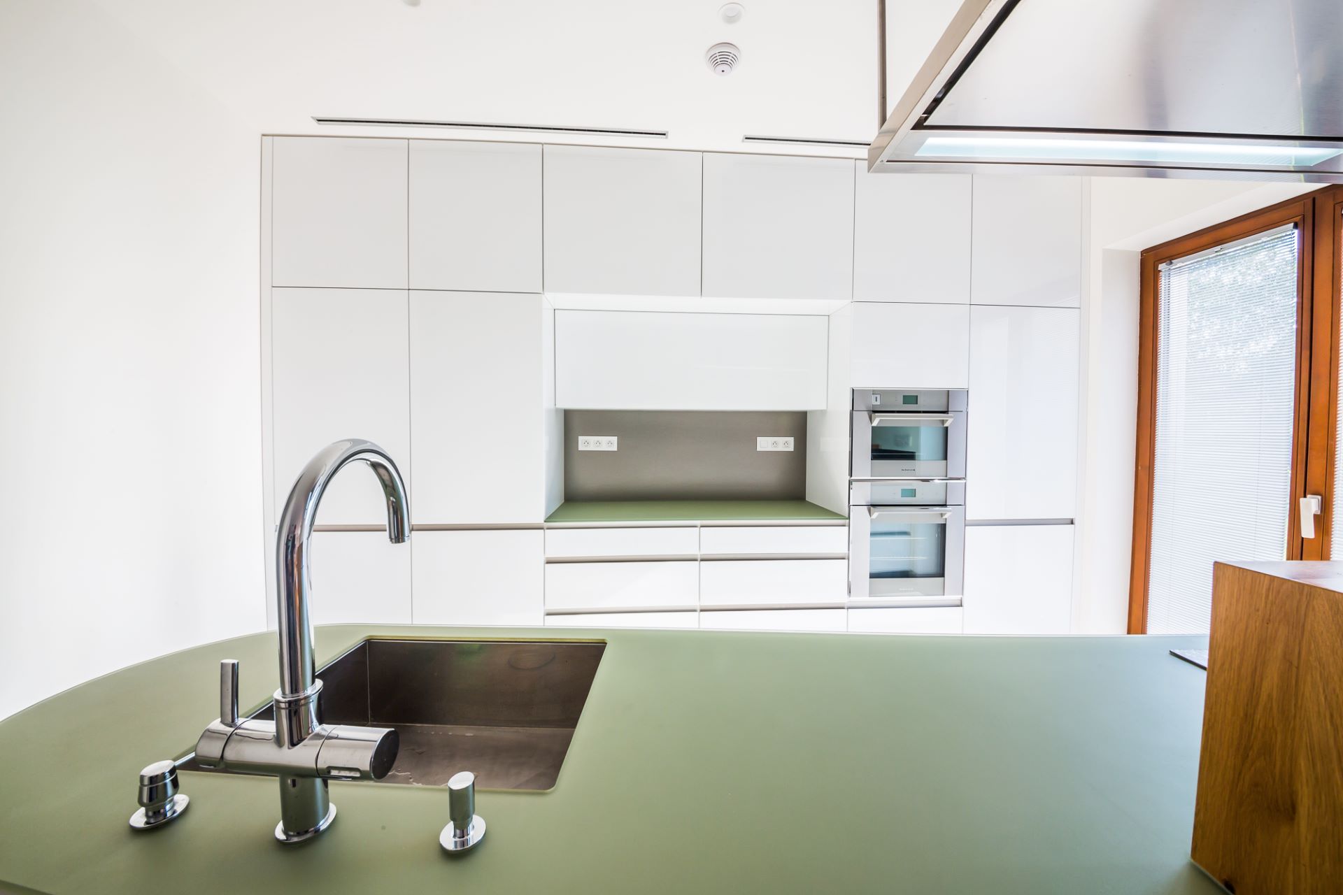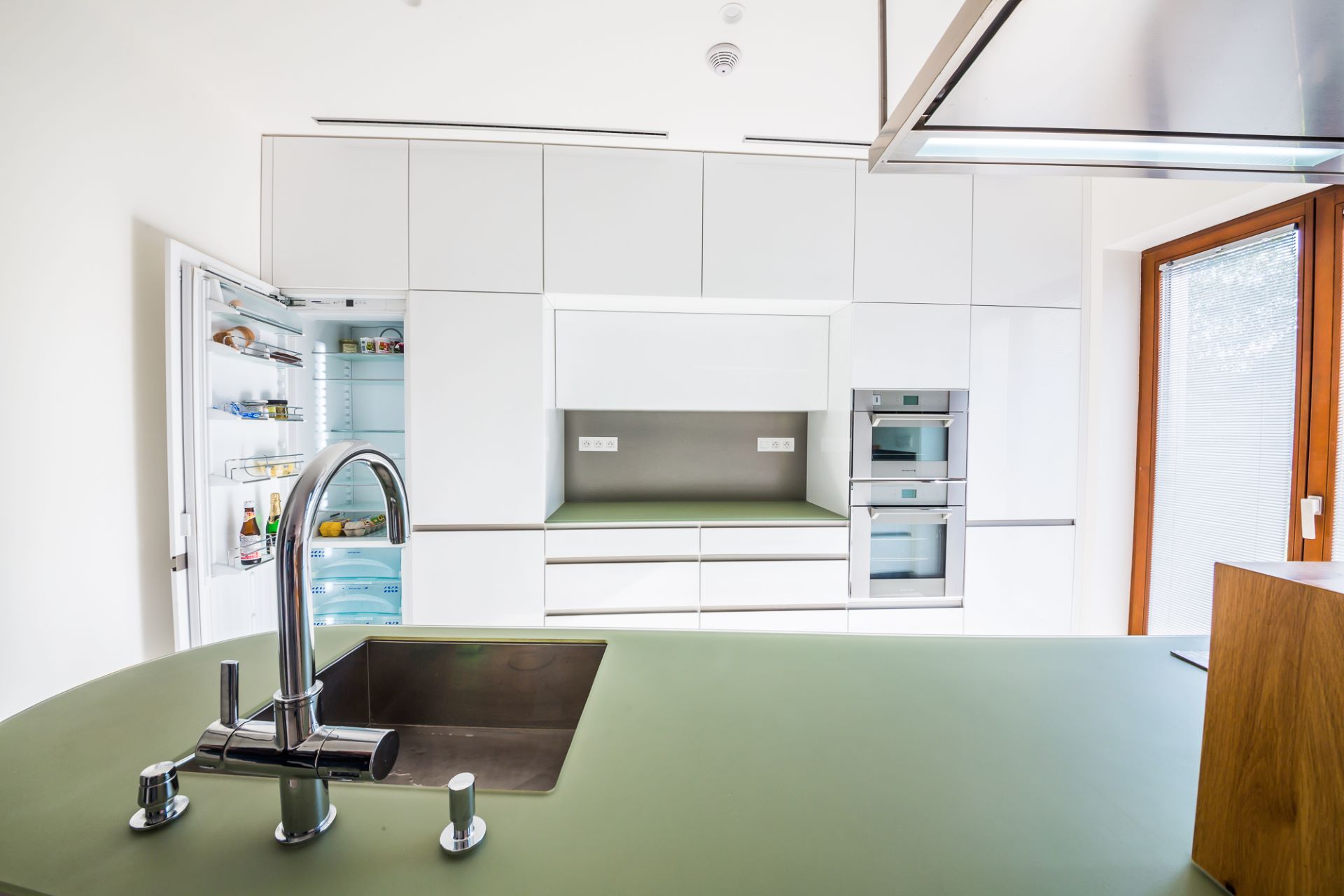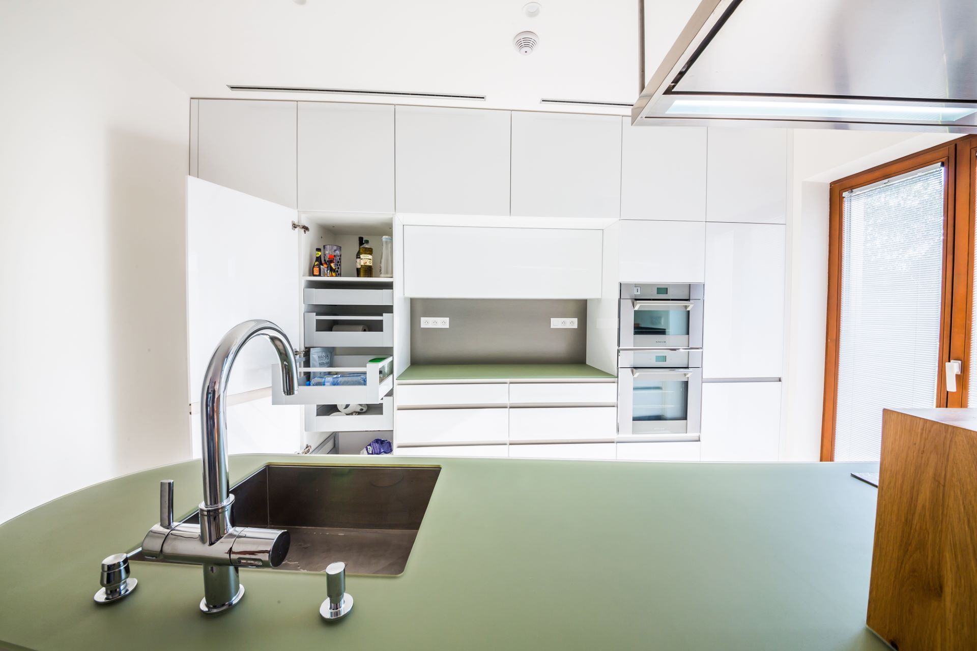 Originálně řešená lakovaná kuchyň ve vysokém lesku s poloostrůvkem. Dominantou kuchyně je bar z masivního dubu, designová digestoř Falmec a skleněná pracovní deska. Se dřevem i lakem krásně kontrastuje použití nerezu u soklu, obložení baru a zástěny, a nakonec u zafrézovaných úchytkových profilů. Zakončení poloostrůvku je vyřešeno obloukem. Přes svoji celkovou velikost nepůsobí kuchyň vůbec mohutně. Je vybavena luxusními spotřebiči De Dietrich, Liebherr a Falmec.