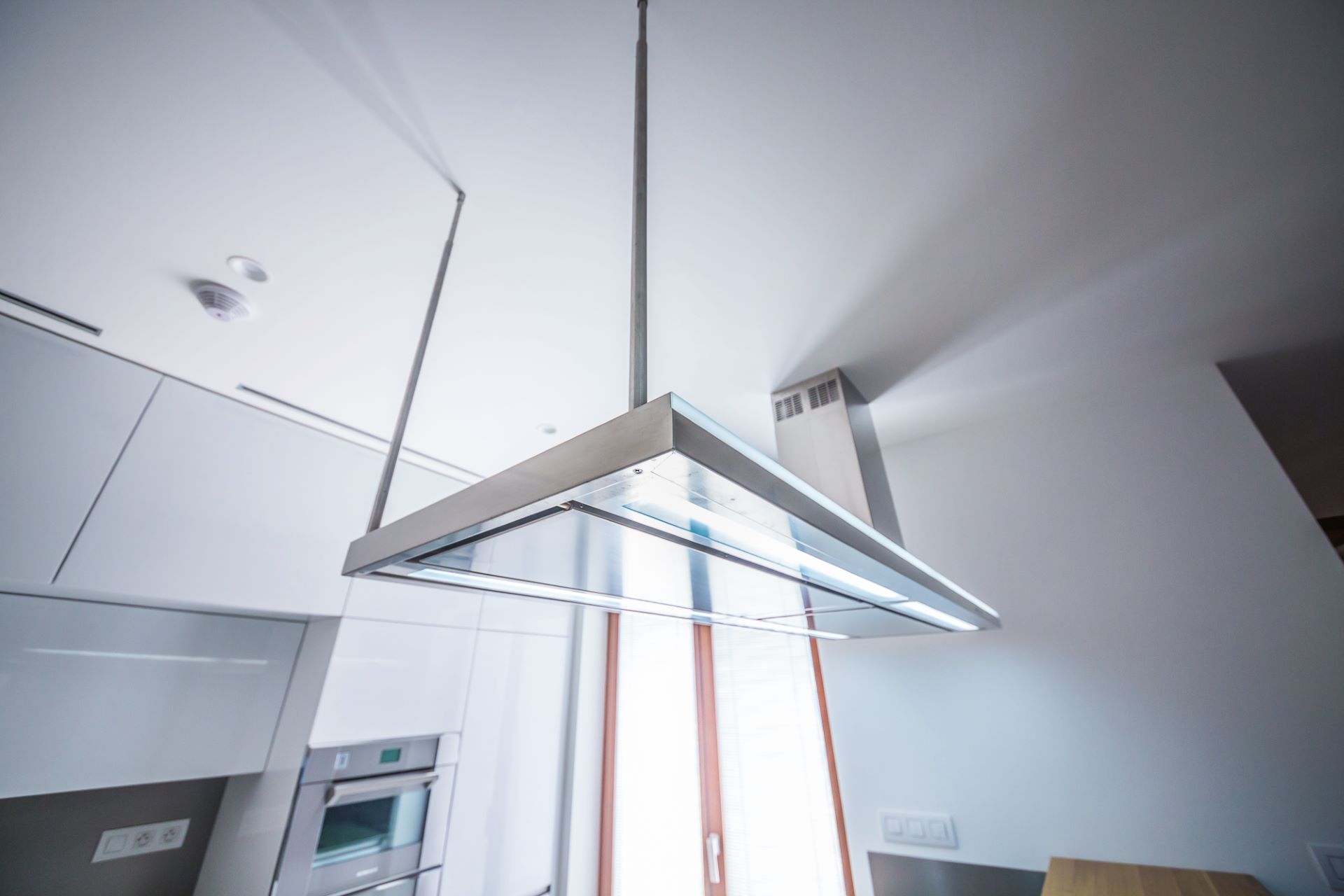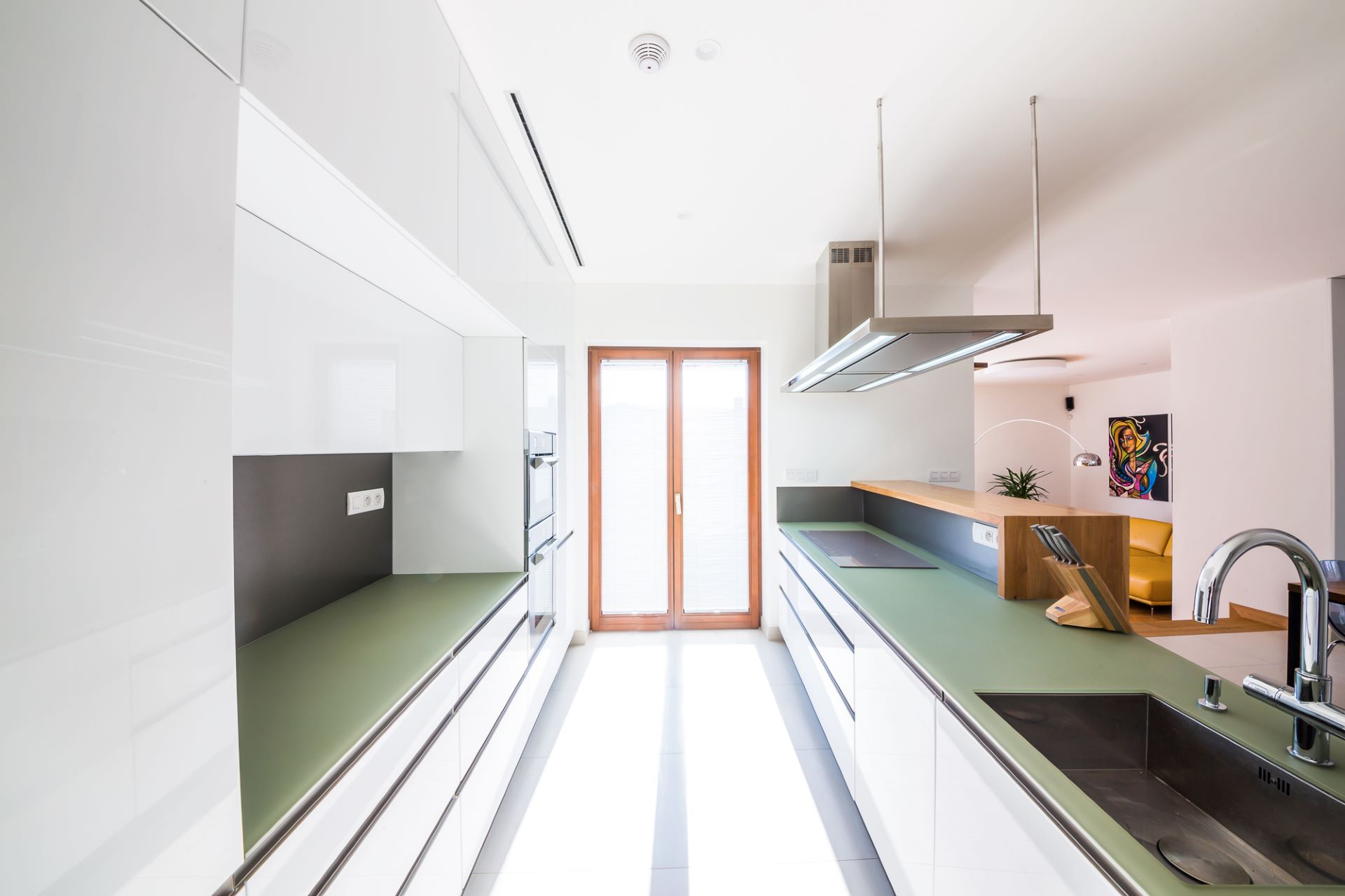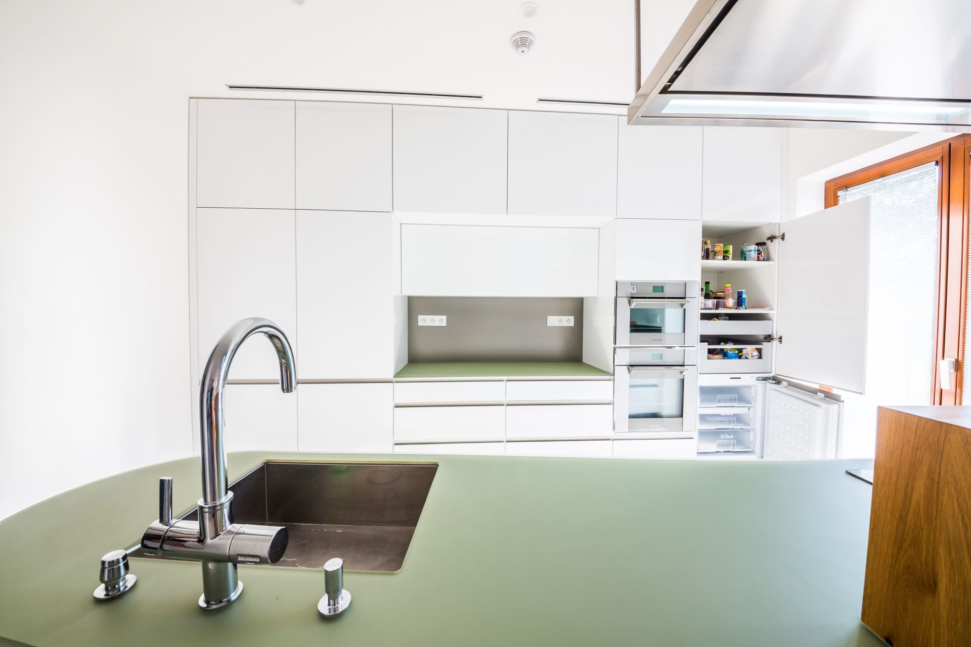 Originálně řešená lakovaná kuchyň ve vysokém lesku s poloostrůvkem. Dominantou kuchyně je bar z masivního dubu, designová digestoř Falmec a skleněná pracovní deska. Se dřevem i lakem krásně kontrastuje použití nerezu u soklu, obložení baru a zástěny, a nakonec u zafrézovaných úchytkových profilů. Zakončení poloostrůvku je vyřešeno obloukem. Přes svoji celkovou velikost nepůsobí kuchyň vůbec mohutně. Je vybavena luxusními spotřebiči De Dietrich, Liebherr a Falmec.