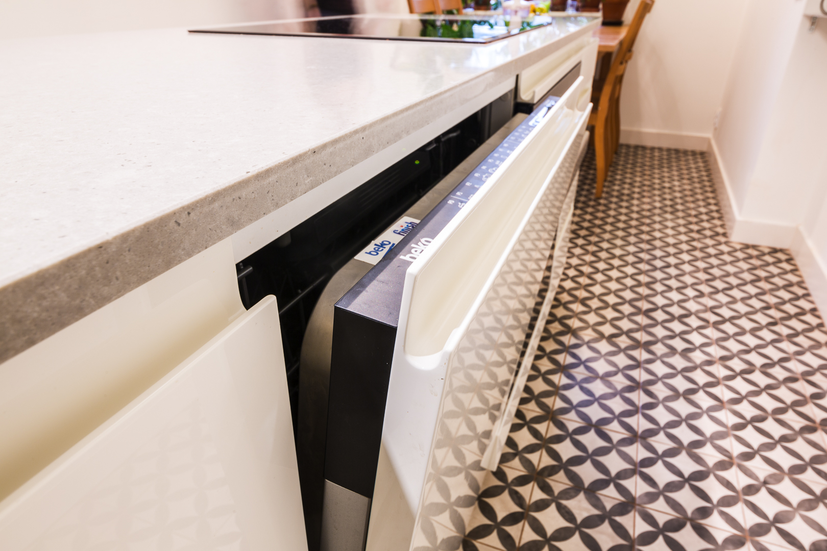 Lakovaná ostrůvková kuchyň, pracovní deska Technistone Concrete