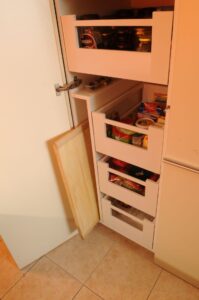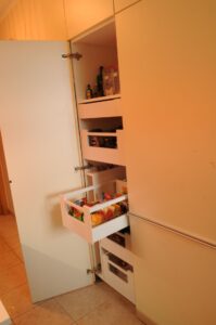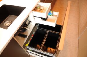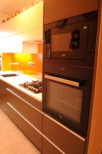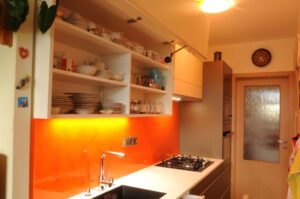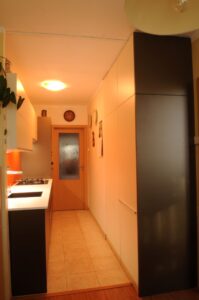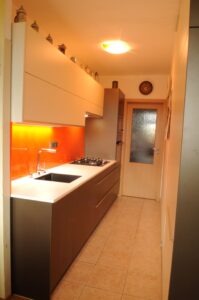 Klasické panelové domy ze 70. let, pozůstatek socialistické éry, s sebou přinášejí specifické výzvy. Jednou z nich jsou malé a striktně oddělené kuchyně, kam se vměstnat vše potřebné bývá často nadlidský úkol. Nejinak tomu bylo i v případě této kuchyně na pražském sídlišti, která volala po radikální proměně, jež by maximálně využila každý centimetr. Cílem rekonstrukce bylo vytvořit moderní, funkční a esteticky příjemný prostor, který by zároveň respektoval omezené rozměry a specifika panelového bytu. Klíčovým prvkem pro optimalizaci prostoru se ukázalo chytré využití stoupačky vzduchotechniky, ke které se podařilo elegantně napojit vysokou potravinovou skříň a vestavěnou lednici. Tím se uvolnila cenná plocha a vytvořilo se kompaktní, ale objemné úložiště. Celá kuchyňská linka je vyrobena z vysoce kvalitního lamina Egger, které je známé svou odolností, snadnou údržbou a širokou škálou moderních dekorů. Pro minimalistický a čistý design bylo zvoleno řešení úchytek v podobě hliníkových narážecích profilůy. Tyto profily se integrují do hran dvířek, minimalizují viditelné elementy a usnadňují otevírání, což je v malém prostoru praktické. Komfort v horní části kuchyně zajišťují skříňky osazené špičkovým kováním, výklopy Blum Aventos s doživotní zárukou. Systémy Aventos jsou vyhledávané pro svůj plynulý chod, tiché dovírání (díky systému BLUMOTION) a možnost zastavení dvířek v jakékoli poloze, což výrazně zvyšuje uživatelský komfort, zejména při práci. Praktickým prvkem je pracovní deska z kompaktního laminátu. Tento moderní, tenký a velmi odolný materiál umožnil realizovat elegantní řešení, kterým je dřez se spodní montáží. Spodní montáž dřezu je u laminátových desek možná jen u kompaktního laminátu, protože je na rozdíl od klasického laminátu nenasákavý po celé tloušťce. Tato instalace eliminuje viditelný okraj dřezu nad deskou, usnadňuje stírání nečistot a vody přímo do dřezu a dodává kuchyni čistý, minimalistický vzhled, srovnatelný s deskami z kamene nebo keramiky. Renovace tak dokázala malou a zastaralou panelákovou kuchyň proměnit v moderní prostor, kde se snoubí špičkové materiály (Egger, Blum) s chytrým prostorovým řešením, které efektivně bojuje s limity danými socialistickou výstavbou.