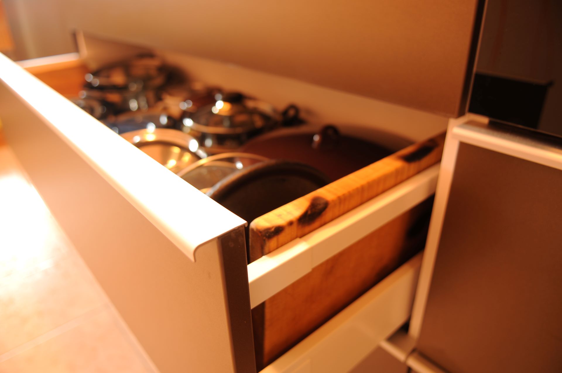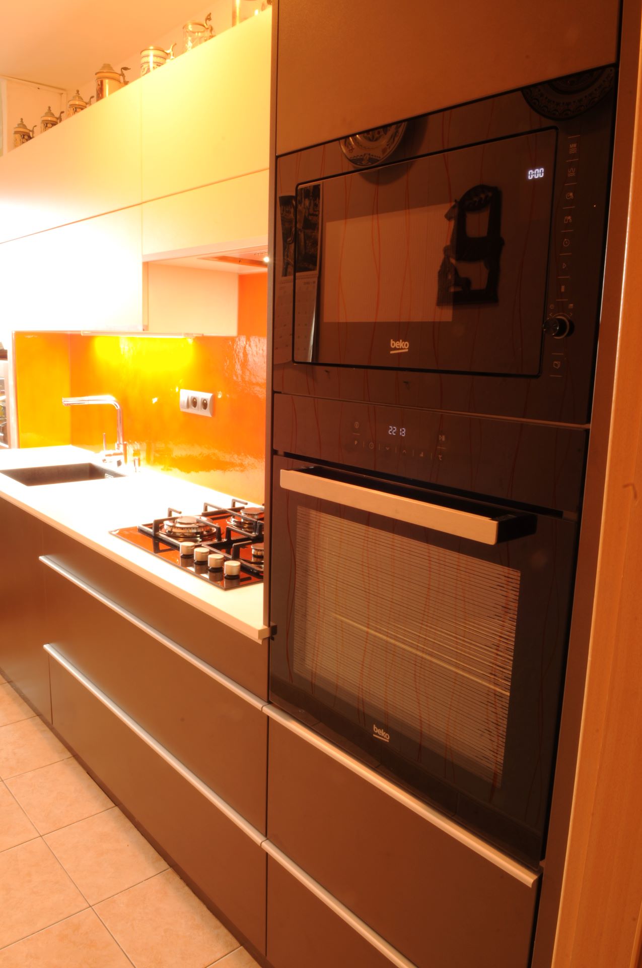Klasické panelové domy ze 70. let, pozůstatek socialistické éry, s sebou přinášejí specifické výzvy. Jednou z nich jsou malé a striktně oddělené kuchyně, kam se vměstnat vše potřebné bývá často nadlidský úkol. Nejinak tomu bylo i v případě této kuchyně na pražském sídlišti, která volala po radikální proměně, jež by maximálně využila každý centimetr. Cílem rekonstrukce bylo vytvořit moderní, funkční a esteticky příjemný prostor, který by zároveň respektoval omezené rozměry a specifika panelového bytu. Klíčovým prvkem pro optimalizaci prostoru se ukázalo chytré využití stoupačky vzduchotechniky, ke které se podařilo elegantně napojit vysokou potravinovou skříň a vestavěnou lednici. Tím se uvolnila cenná plocha a vytvořilo se kompaktní, ale objemné úložiště. Celá kuchyňská linka je vyrobena z vysoce kvalitního lamina Egger, které je známé svou odolností, snadnou údržbou a širokou škálou moderních dekorů. Pro minimalistický a čistý design bylo zvoleno řešení úchytek v podobě hliníkových narážecích profilůy. Tyto profily se integrují do hran dvířek, minimalizují viditelné elementy a usnadňují otevírání, což je v malém prostoru praktické. Komfort v horní části kuchyně zajišťují skříňky osazené špičkovým kováním, výklopy Blum Aventos s doživotní zárukou. Systémy Aventos jsou vyhledávané pro svůj plynulý chod, tiché dovírání (díky systému BLUMOTION) a možnost zastavení dvířek v jakékoli poloze, což výrazně zvyšuje uživatelský komfort, zejména při práci. Praktickým prvkem je pracovní deska z kompaktního laminátu. Tento moderní, tenký a velmi odolný materiál umožnil realizovat elegantní řešení, kterým je dřez se spodní montáží. Spodní montáž dřezu je u laminátových desek možná jen u kompaktního laminátu, protože je na rozdíl od klasického laminátu nenasákavý po celé tloušťce. Tato instalace eliminuje viditelný okraj dřezu nad deskou, usnadňuje stírání nečistot a vody přímo do dřezu a dodává kuchyni čistý, minimalistický vzhled, srovnatelný s deskami z kamene nebo keramiky. Renovace tak dokázala malou a zastaralou panelákovou kuchyň proměnit v moderní prostor, kde se snoubí špičkové materiály (Egger, Blum) s chytrým prostorovým řešením, které efektivně bojuje s limity danými socialistickou výstavbou.