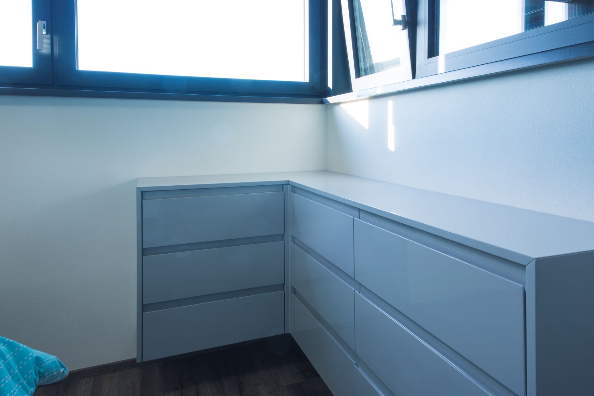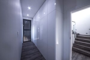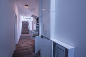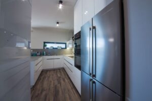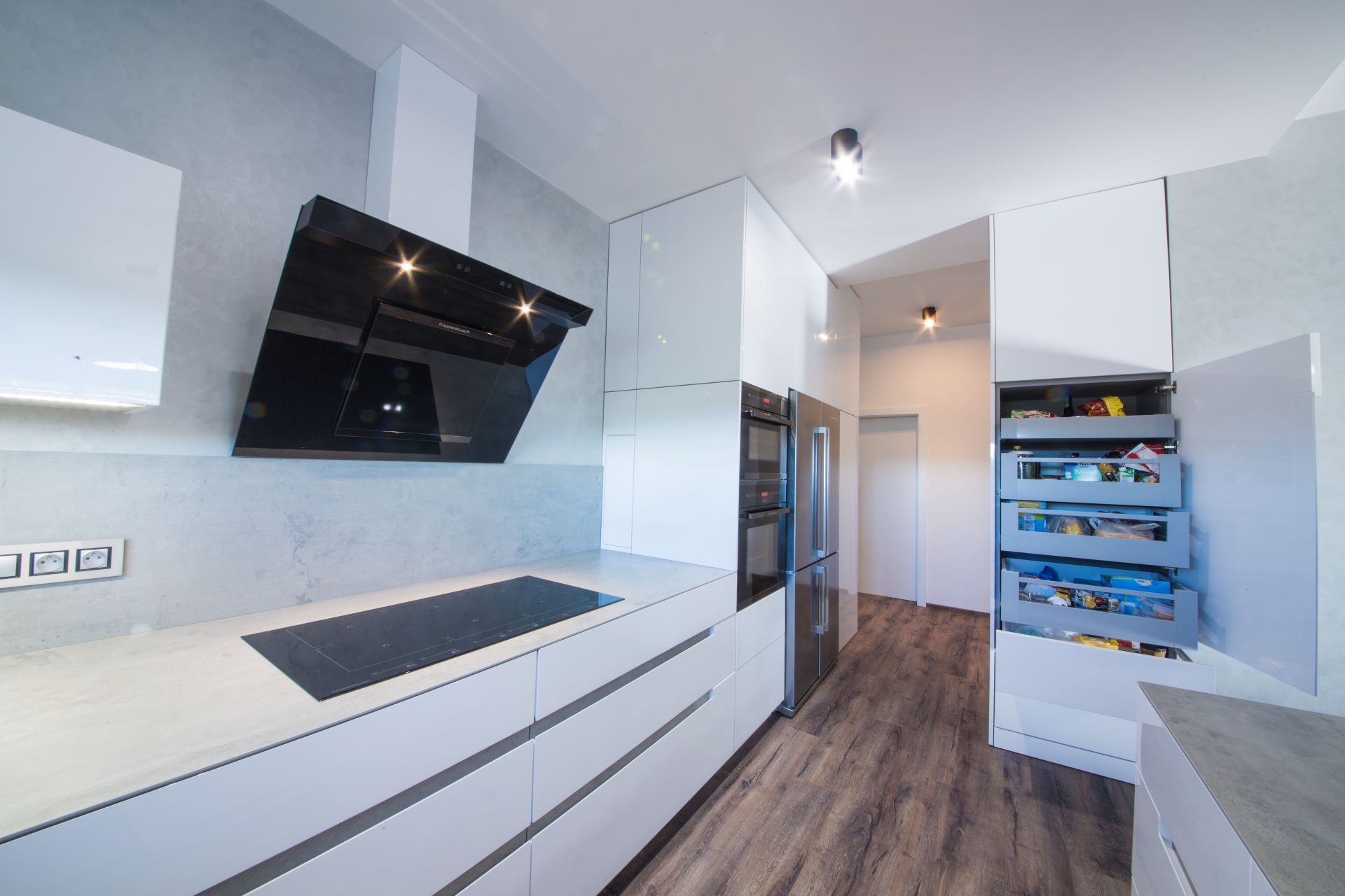 Luxusní kuchyňská linka s lakovanými čelními plochami, keramická pracovní deska v dekoru betonu a prémiovými spotřebiči Küppersbusch. Kromě kuchyně jsme dodali také spoustu velmi atypického nábytku. Vše z prémiových materiálů, vše a v nejlepší kvalitě.