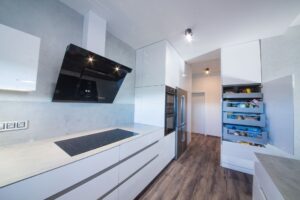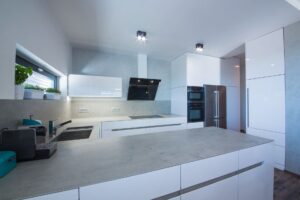 Luxusní designová bílá kuchyň, keramická deska v dekoru beton, ostatní nábytek