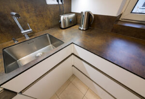 Majitelé si přáli moderní vzhled, který by do staršího domu vnesl svěží vítr, a zamilovali se do odvážné kombinace: čisté bílé a dekoru „rezavého železa“ (corten). Bílá barva na horních skříňkách a pracovních plochách prostor opticky zvětšuje a prosvětluje, zatímco tmavý, strukturovaný dekor na spodních skříňkách dodává kuchyni hloubku, industriální šmrnc a moderní, ale zároveň útulný nádech. Tato kombinace je nejen vizuálně působivá, ale i praktická.