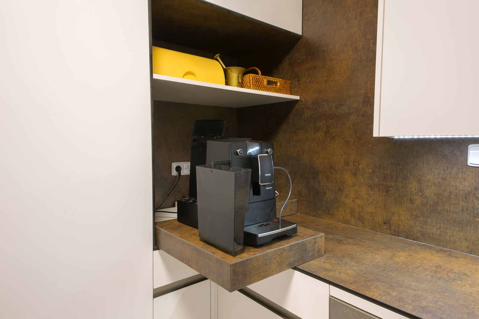 Největší důraz byl kladen na manipulaci s těžkými spotřebiči, jako je kávovar a kuchyňský robot. Seniorní pár potřeboval pohodlný a bezpečný přístup k těmto často používaným pomocníkům, aniž by je musel neustále zvedat, přesouvat nebo namáhavě vytahovat ze skříní.