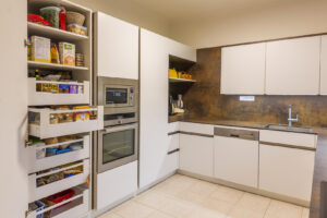 - Široké výsuvy namísto klasických skříněk pro lepší přehlednost a přístup k nádobí.