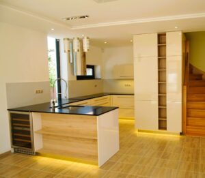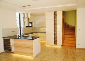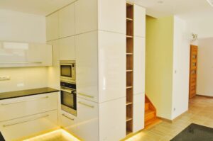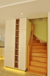 Rekonstrukce rodinného domu v širším centru Prahy stála před náročným úkolem: navrhnout kuchyni, která by plně vyhovovala potřebám početné šestičlenné rodiny. V takovém případě je velikost a efektivní úložný prostor naprostý základ. Největší architektonickou překážkou se však ukázalo masivní dřevěné schodiště, které procházelo přímo v blízkosti kuchyňského prostoru a téměř znemožňovalo umístění klíčových vysokých skříní. Tato výzva si vyžádala netradiční a chytré řešení: vestavbu vysokých skříní přímo do prostoru pod a kolem schodiště.
