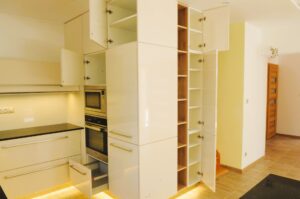 Tato důmyslná vestavba poskytuje obrovskou kapacitu pro zásoby a spotřebiče, přičemž zachovává čistý a hladký vzhled kuchyně. O tom, které čílko je pevné a které se dá otevřít, má přehled pouze majitel, což přidává tomuto řešení špetku hravé exkluzivity.