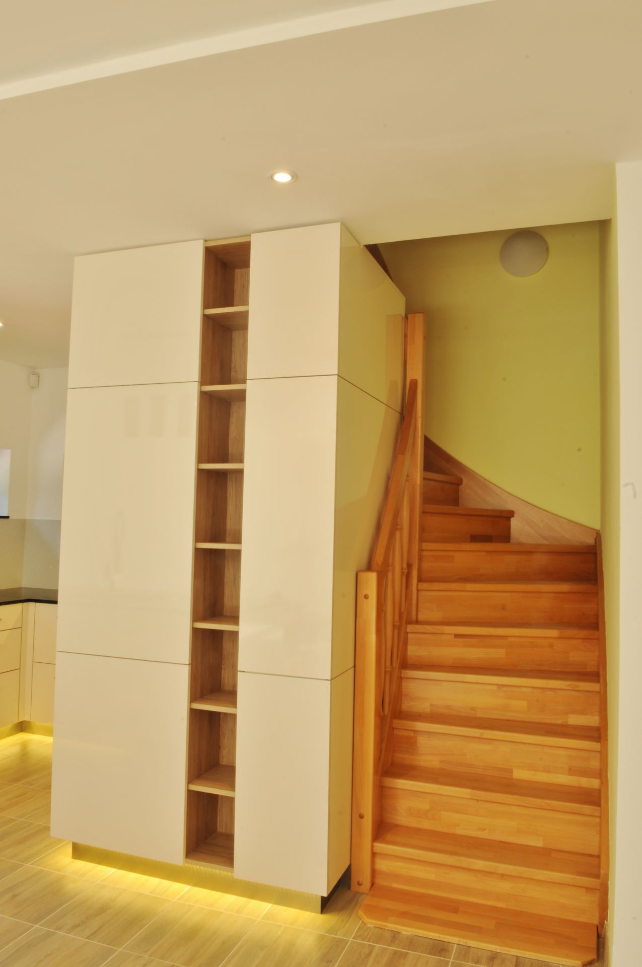 Přístup pod schodiště je známý jako skvělý úložný prostor, ale zde šlo o integraci do jednolité plochy kuchyňské linky. Vznikl tak blok vysokých skříní, jejichž výška se plynule mění, kopírujíc stoupající schodiště. Části schodiště, které procházejí přímo nad skříňkami, jsou pak precizně zakryty sjednocenými čílky.