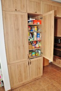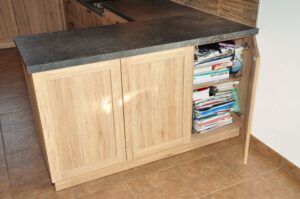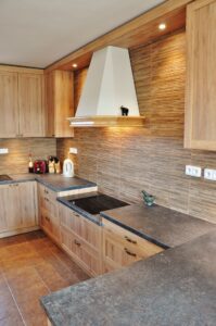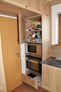 Tato rustikální kuchyň je vyrobena z lamina a perfektě vyplňuje dostatečně velký prostor. otevřený prostor. Krásná retro digestoř dokonale ladí k požadovanému stylu. Potravinová skříň doplňuje velkou, monoklimatickou lednici, takže rodina nikdy nebude mít problém s nedostatečnou kapacitou pro uskladnění potravint. Jedním z požadavků byla níže položená varná deska. toto řešení je z pohledu ergonomie naprosto ideální, ale vzhledem k dopadu do vzhledku kuchyně je k vidění pouze zřídka.