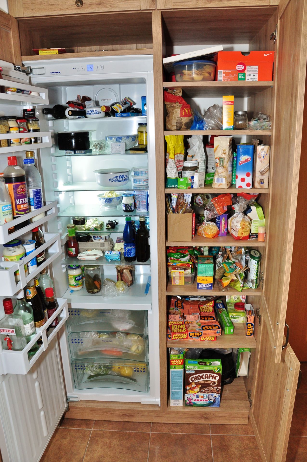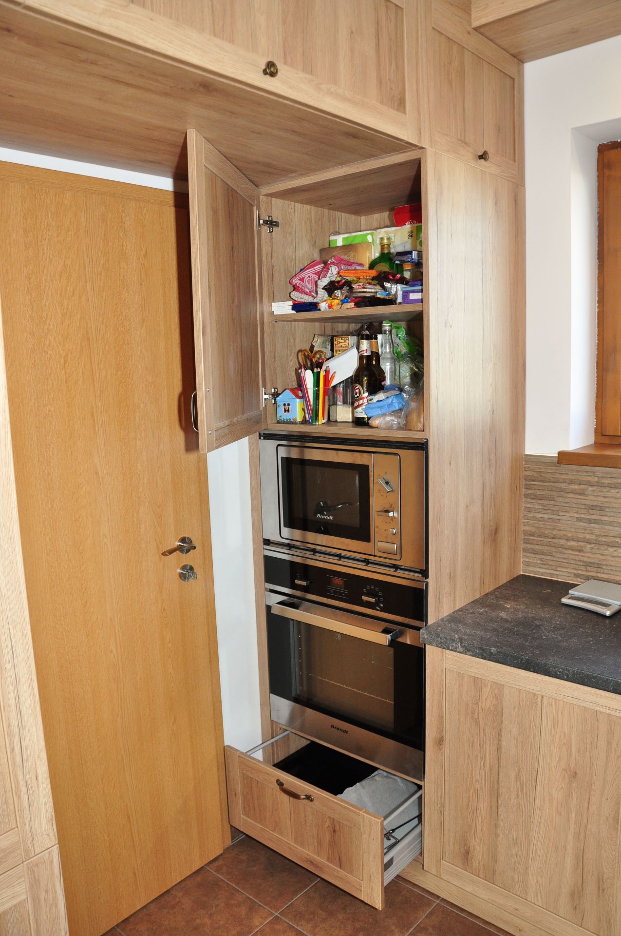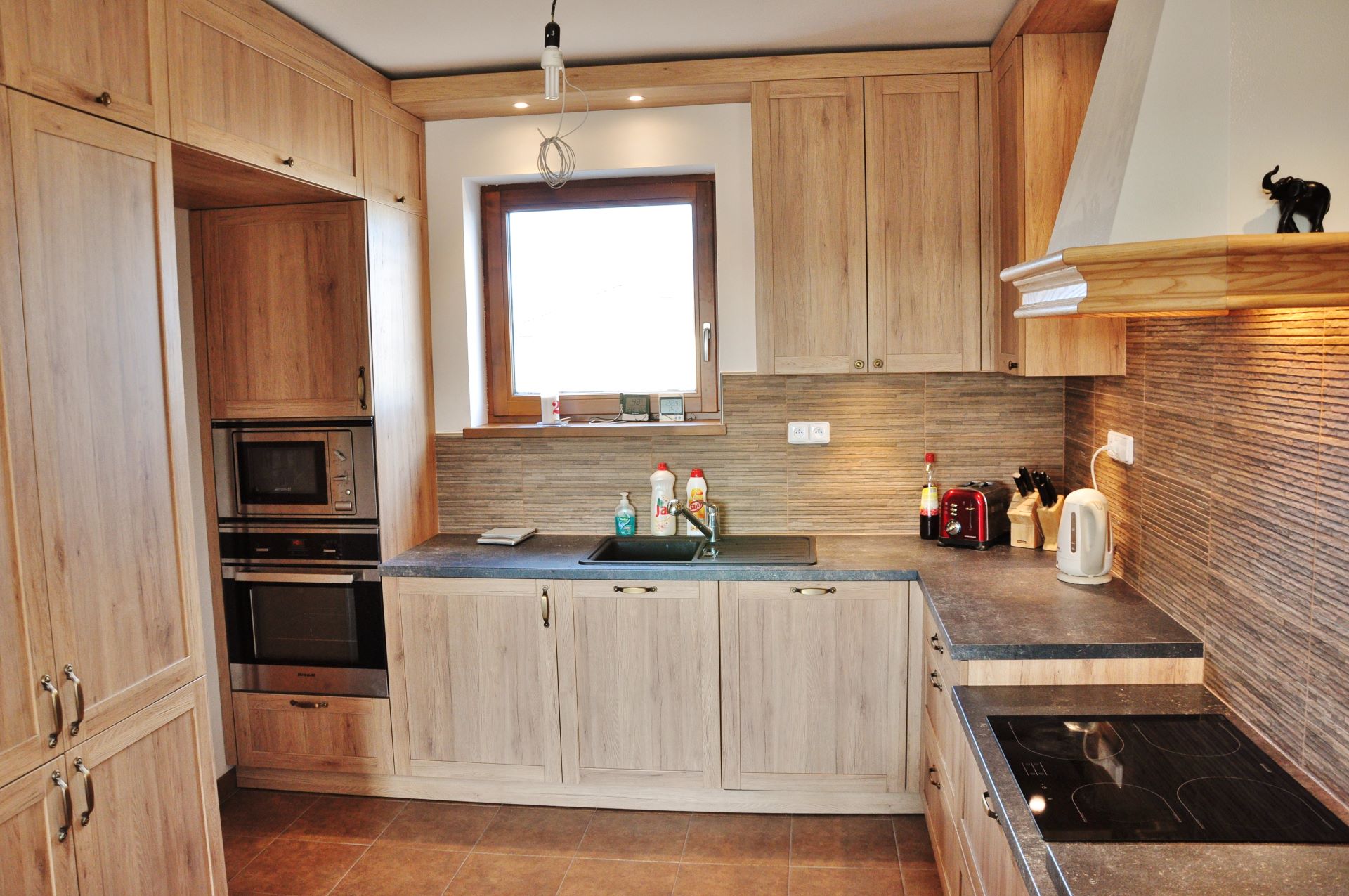 Tato rustikální kuchyň je vyrobena z lamina a perfektě vyplňuje dostatečně velký prostor. otevřený prostor. Krásná retro digestoř dokonale ladí k požadovanému stylu. Potravinová skříň doplňuje velkou, monoklimatickou lednici, takže rodina nikdy nebude mít problém s nedostatečnou kapacitou pro uskladnění potravint. Jedním z požadavků byla níže položená varná deska. toto řešení je z pohledu ergonomie naprosto ideální, ale vzhledem k dopadu do vzhledku kuchyně je k vidění pouze zřídka.