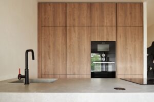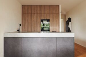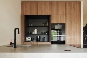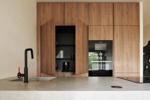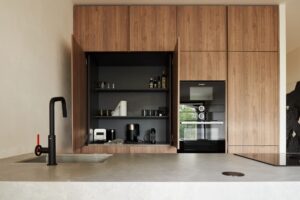 Skryté kování v nábytku znamená, že se dvířko po otevření zasune do korpusu a i v otevřeném stavu nebrání uživateli kuchyň pohodlně používat.