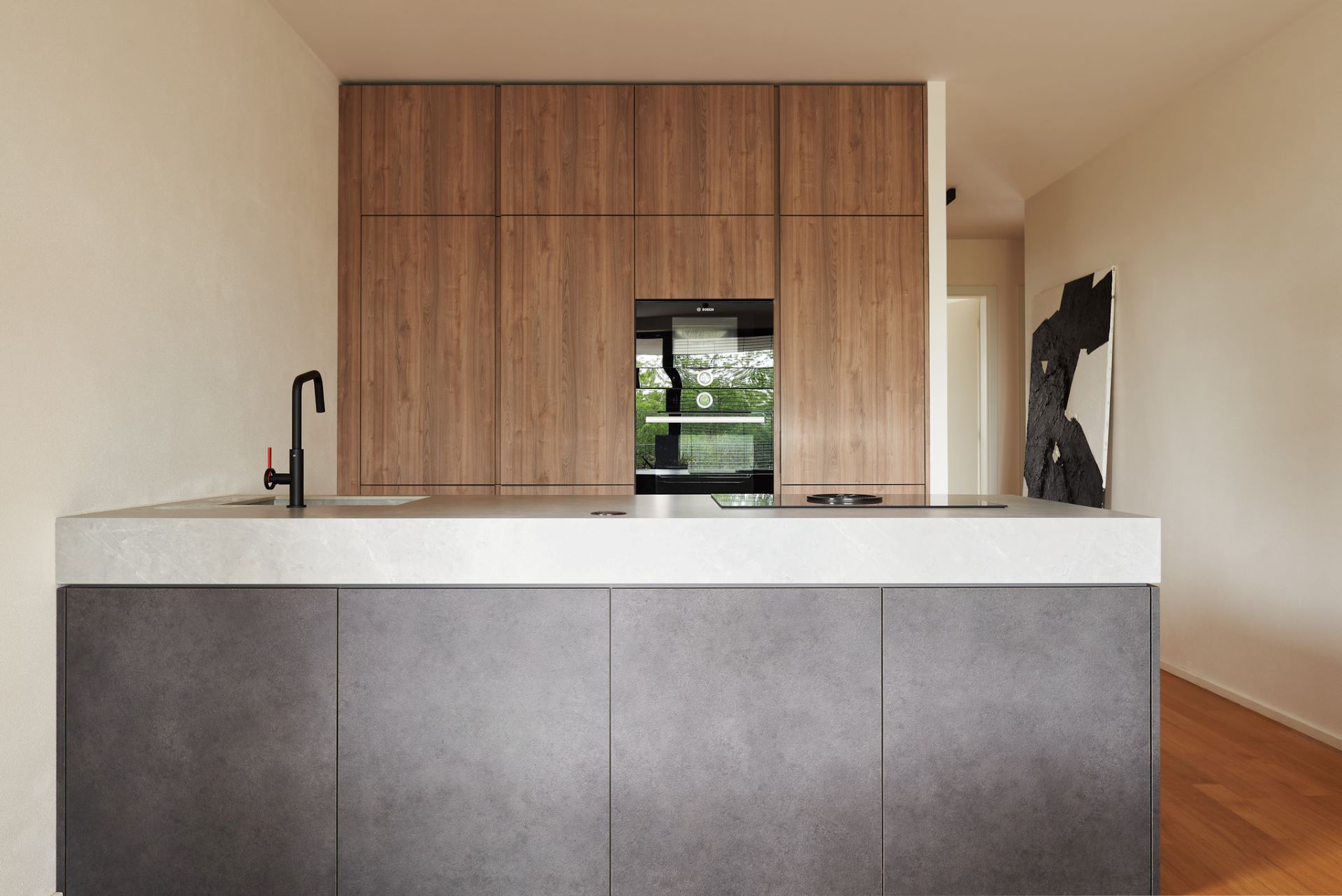 U novostaveb bytových domů se občas setkáváme se situací, kdy prostor pro budoucí kuchyň je velmi, velmi skromný. Jako třeba v tomto případě. Zákazník jednoznačně nechtěl kuchyň ve tvaru U nebo L, jeho sen byla varná deska s odsavačem do prostoru. Volba padla na rovnoběžné dispozice o cekové délce cca 250cm. V takové kuchyňce pak ale není téměř žádné místo pro toustovač, kávovar, mixér nebo jiné drobné elektrické pomocníky. Zkrátka spotřebiče nebo jiné drobnosti, které mají být sice po ruce, ale nemají být vždy vidět. A právě skryté kování v kuchyni je řešení ideální přesně pro tento případ.