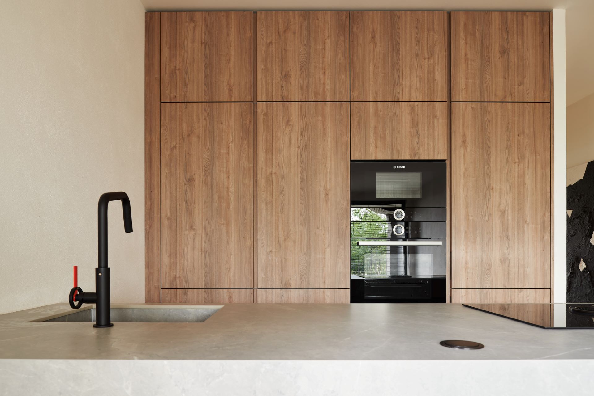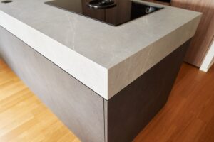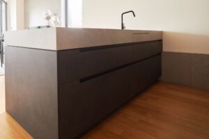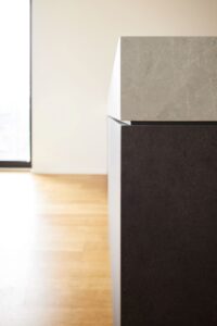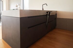 Před přírodním kamenem nakonec dostala přednost keramická pracovní deska. Celý obvod barové části jsme oblepili krásným lemováním. Velmi zajímavým prvkem je keramická pásek na dvířku myčky, který na tento lem perfektně navazuje a tvoří kompaktní celek. Ze stejného materiálu keramiky jsme vyrobili také skládaný, keramický dřez.