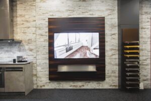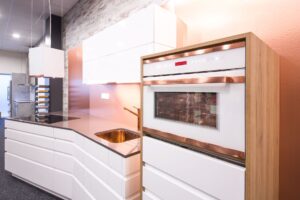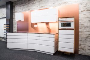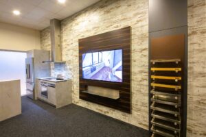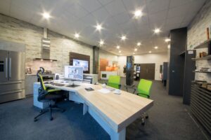 Vzorovým nábytkem jsme vybavili kompletní kuchyňské studio v Praze, pro které jsme vyráběli kuchyně od roku 2013. Vše na prvním obrázku je od nás: obklady stěn a sloupů, stojan uprostřed prostoru, betonový pracovní stůl i zbytek, vše jsme dodávali my.