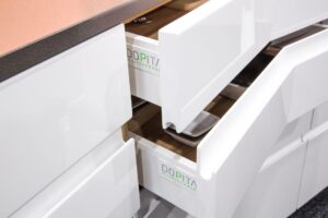 Lakovaná kuchyň s frézováním, keramická pracovní deska a obklad Laminam